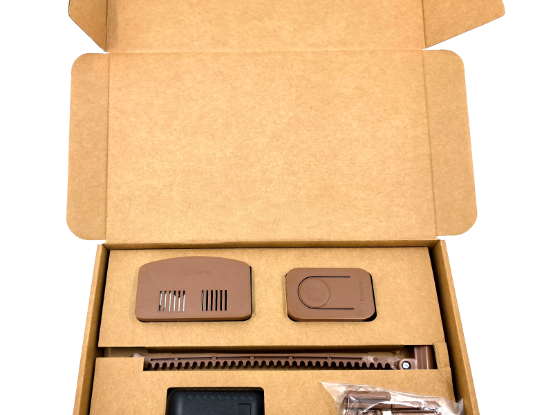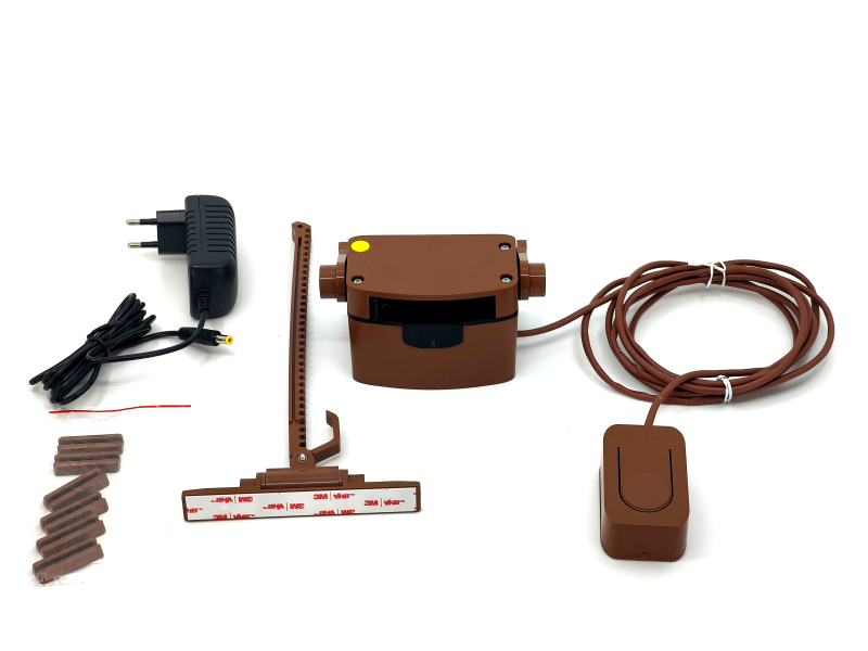 - SMARWI v hnědé barvě (tělo přístroje s držákem vybaveným lepicí páskou) a bezpečnostní ovládací box BoB vybavený lepicí páskou a připojený kabelem